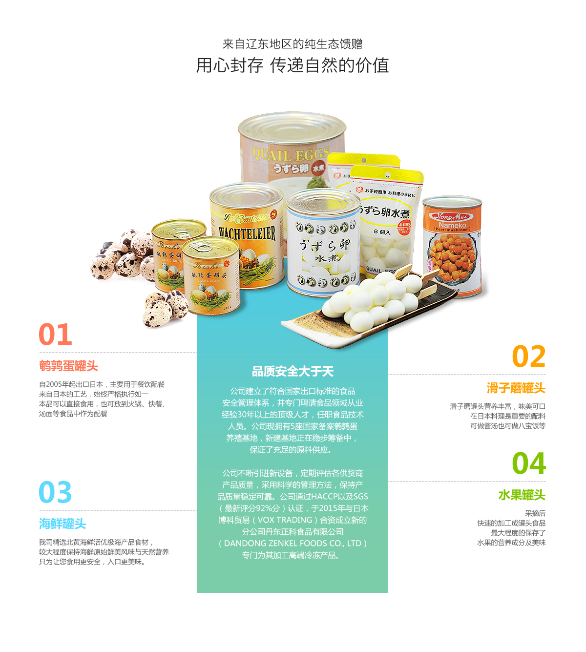 丹東日食食品有限公司是一家專注罐頭及速凍生產的食品加工型企業(yè)。公司主要產品為鵪鶉蛋罐頭、滑子蘑罐頭、冷凍產品等,年產量約5000噸。其中,鵪鶉蛋罐頭出口量位居近年國內之冠;滑子蘑罐頭出口量也列國內前位。各種產品主要出口日本,并遠銷德國、澳大利亞、新加坡等國家和地區(qū)。